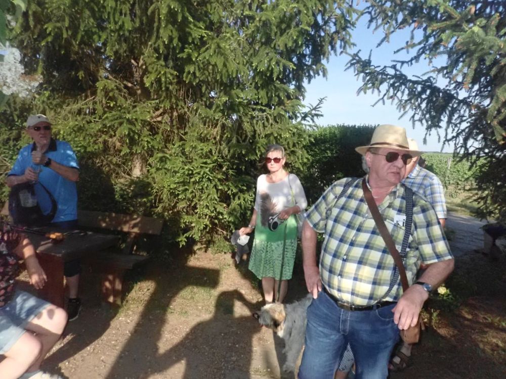 Um 18 Uhr war Treffpunkt und Start am Sportgelände Hildebrandseck. Zuerst ging es durch den nördlichen Teil der „Mußbacher Eselshaut“ in Richtung Ruppertsberg zu der Weinlage Gaisböhl. Hier erwartete die Wanderer ein Umtrunk mit Wein aus der Weinlage „Linsenbusch“ und eine Brezel gab es auch dazu.