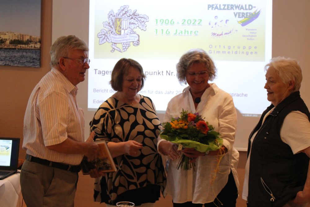Am Samstag 09.07.2022, fand die von der 1. Vorsitzenden Edelgard Schäker souverän geführte, Mitgliederversammlung der Ortsgruppe Gimmeldingen des Pfälzerwald-Vereins statt. Hierbei wurden zahlreiche Mitglieder für ihre langjährige Mitgliedschaft geehrt, und zwar für 40 Jahre Erich und Inge Estelmann, Wolfgang Schöneberger, Rosemarie Schupp, Jürgen Trapp, Werner Ullrich, Gustav Brunner, Josefine Feldmann und Jürgen Wittmann. Bereits 50 Jahre gehören dem Verein Fritz Christmann, Walter Hauck, Irma Steigelmann, Reinhard Bischofsberger Erich Peters sowie Franz und Helga Luck an.